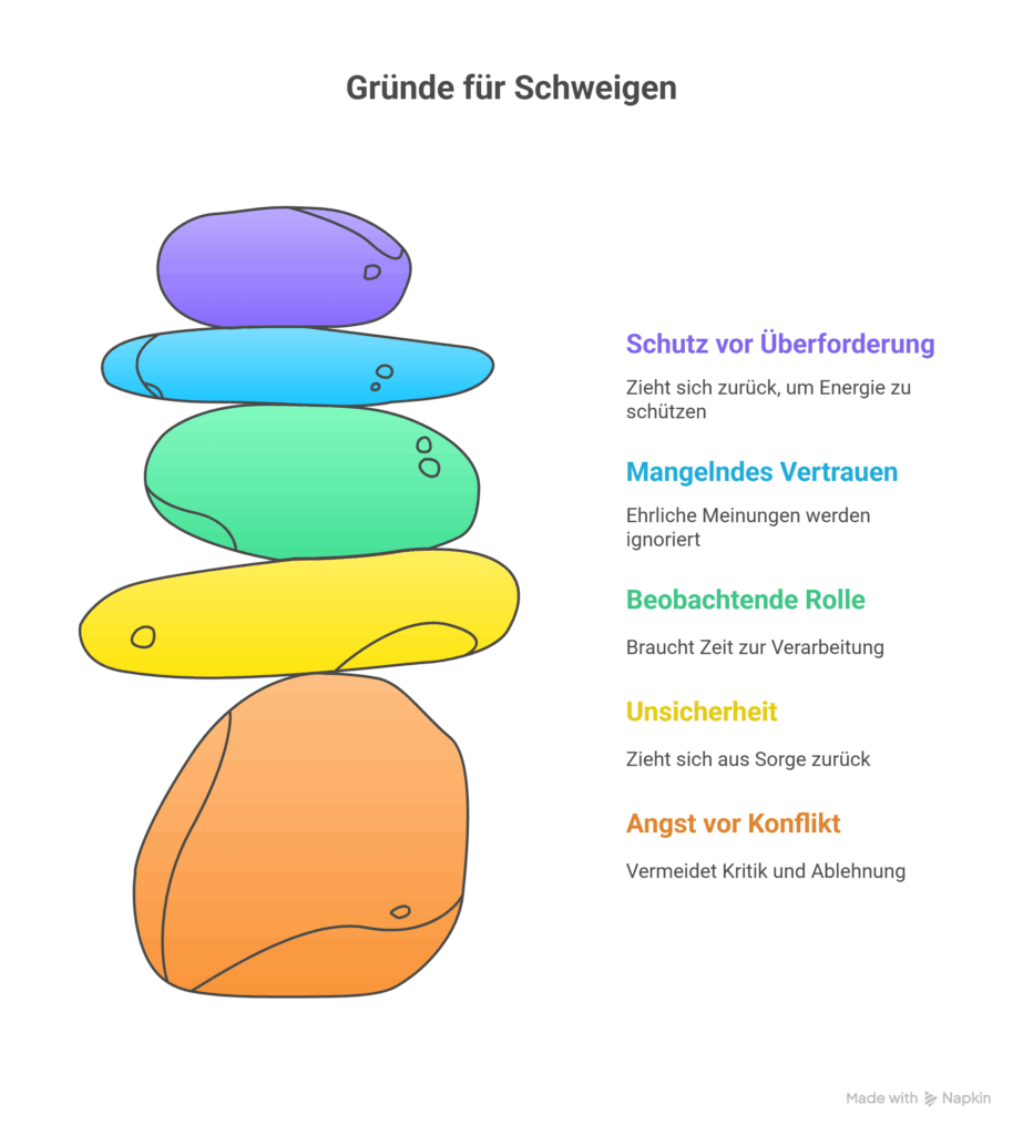 Doch Schweigen kann mehr sein als bloße Zurückhaltung. Es kann ein Zeichen sein: dafür, dass jemand sich unsicher fühlt, sozialen Risiken aus dem Weg gehen möchte oder schlicht keinen Raum sieht, um sich einzubringen.